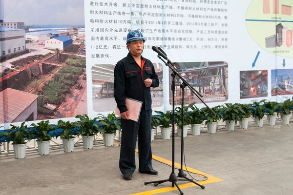 ( 图为:山东耐材集团董事长、党委书记刘伟介绍新项目建设、生产情况。)