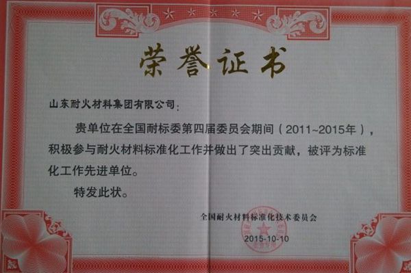 山东耐材再获全国耐标委标准化工作先进单位荣誉称号
