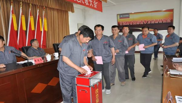 - 5月31日,山东耐材集团在公司总部三楼会议室召开党员代表大会。山东耐材党委书记、董事长车连房作了题为《以政治建设为统领,深入推进全面从严治党,推动生产经营和改革发展取得新成效》的讲话。