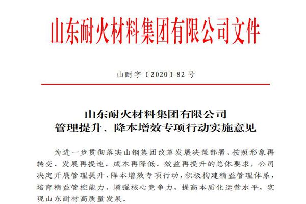 近日,山东耐材下发《山东耐火材料集团有限公司管理提升、降本增效专项行动实施意见》,按照形象再转变、发展再提速、成本再降低、效益再提升的工作新要求,广泛发动,深入开展管理提升、降本增效专项行动。