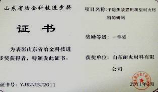 ■ 干熄焦装置用新型耐火材料的研制是2010年山东省第四批技术创新项目,2011年3月获山东省冶金科技进步奖一等奖。